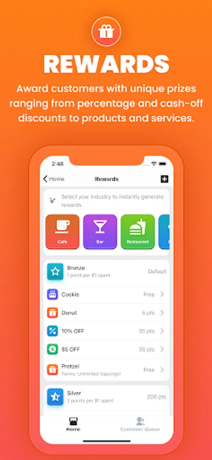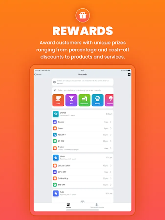 Award customers with unique prizes ranging from percentage and cash-off discounts to products and services.