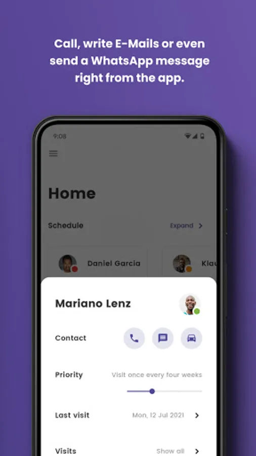 Get direct access to different ways to get in touch with your customers. With a single click on a customer in the app, you can start a route directly with Google Maps, write a message with WhatsApp or send an email to the address you have stored.
