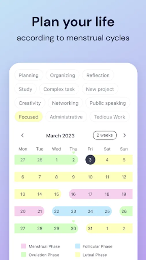 Essence improves well-being, balances hormones and boosts productivity by optimizing tasks, meetings, workouts and nutrition according to the four phases of your menstrual cycle.