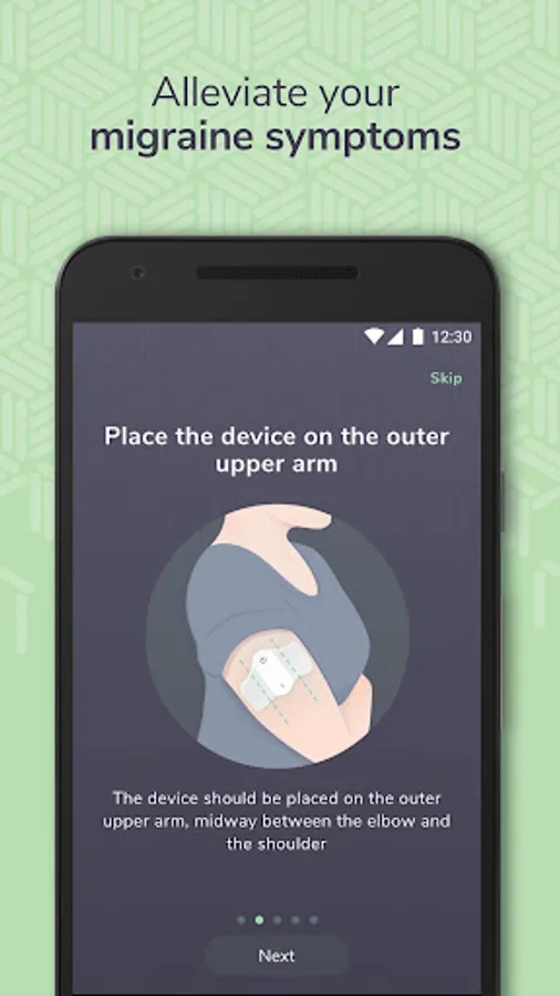 This prescribed device is self-applied to the upper-arm and should be used in the home environment at the onset of migraine headache or aura, or every other day for preventive treatment.