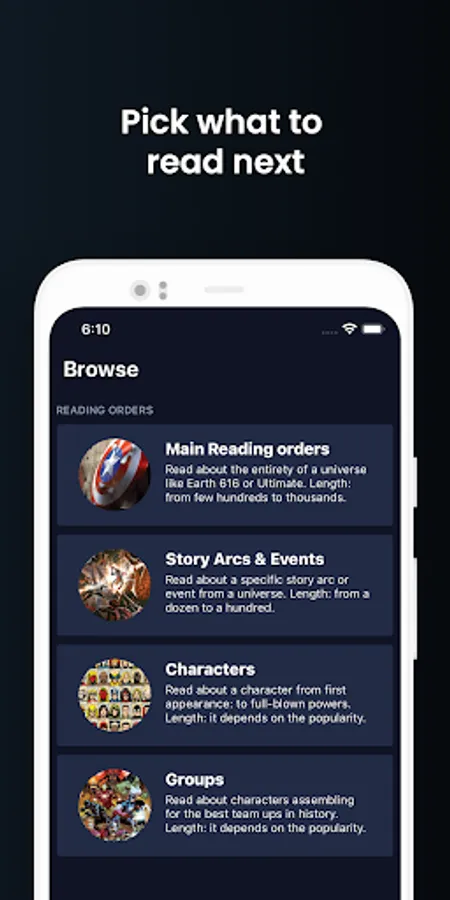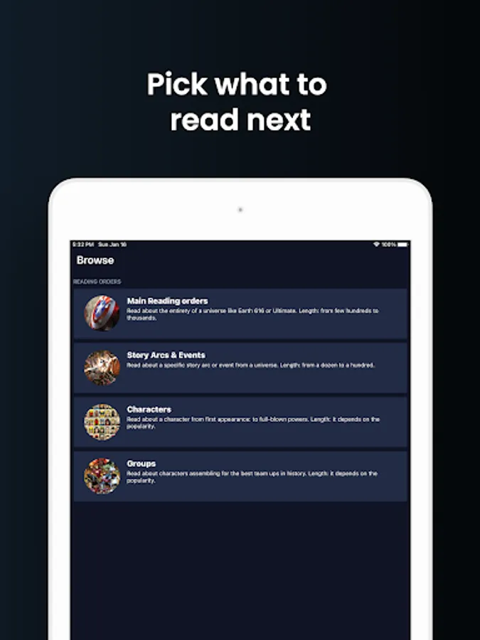 Select a character, event, story arc or follow the main core order and keep track of what you read. The reading orders are crowdsourced by fans for fans.