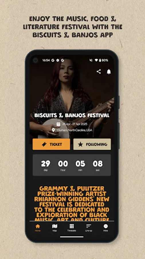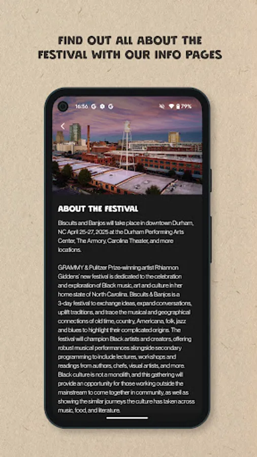 Join us for Biscuits & Banjos Festival 2025, a 3-day festival celebrating the rich history and culture of Black string and old time music in the heart of Durham, NC! Curated by Grammy and Pulitzer-winning artist Rhiannon Giddens, the event will feature live performances from renowned musicians, engaging workshops, and insightful discussions on the intersections of music, food, and culture. Whether you love country, folk, blues, or jazz, this event has something for everyone. Use this festival app to prepare for this unforgettable event.