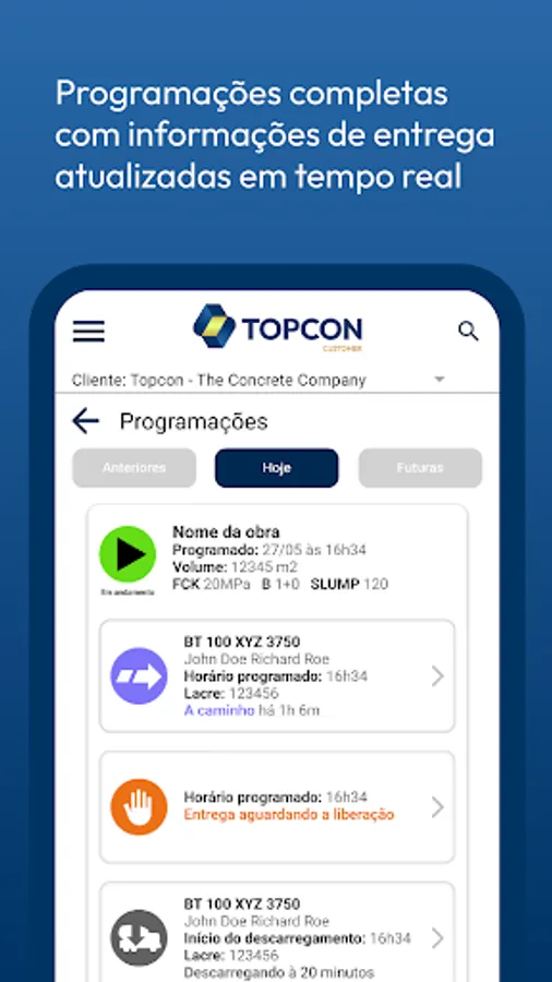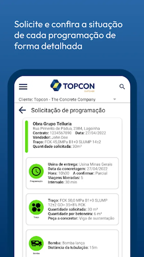 Through a simple and intuitive interface, TOPCON CUSTOMER allows you to manage the delivery of concrete with indicators of programming request, status of each delivery, reports and concrete technology, payments and invoice situations, thus allowing decision-making and avoiding idleness. in the logistical process.