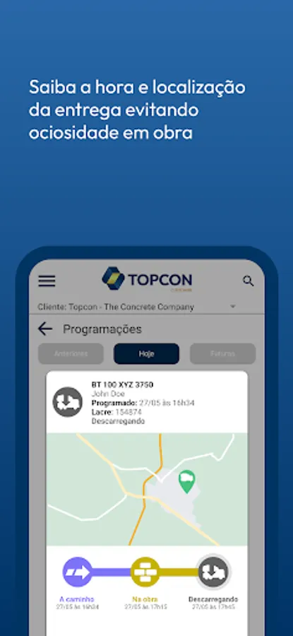 Through a simple and intuitive interface, TOPCON CUSTOMER allows you to manage concrete delivery with scheduling request indicators, status of each delivery, reports and concrete technology, payments and invoice status, thus allowing decision-making and avoiding idleness in the logistics process.