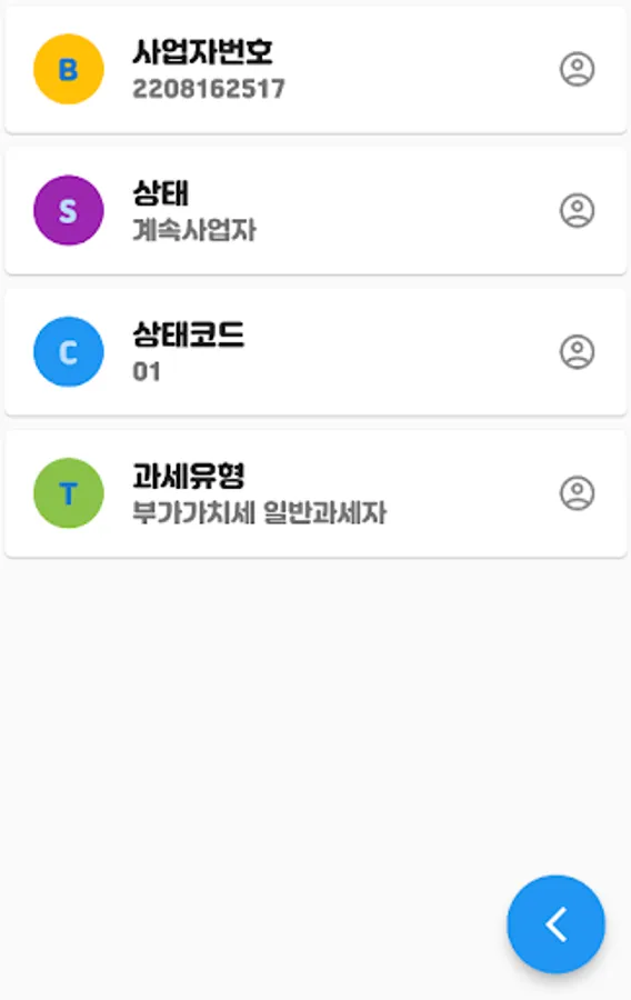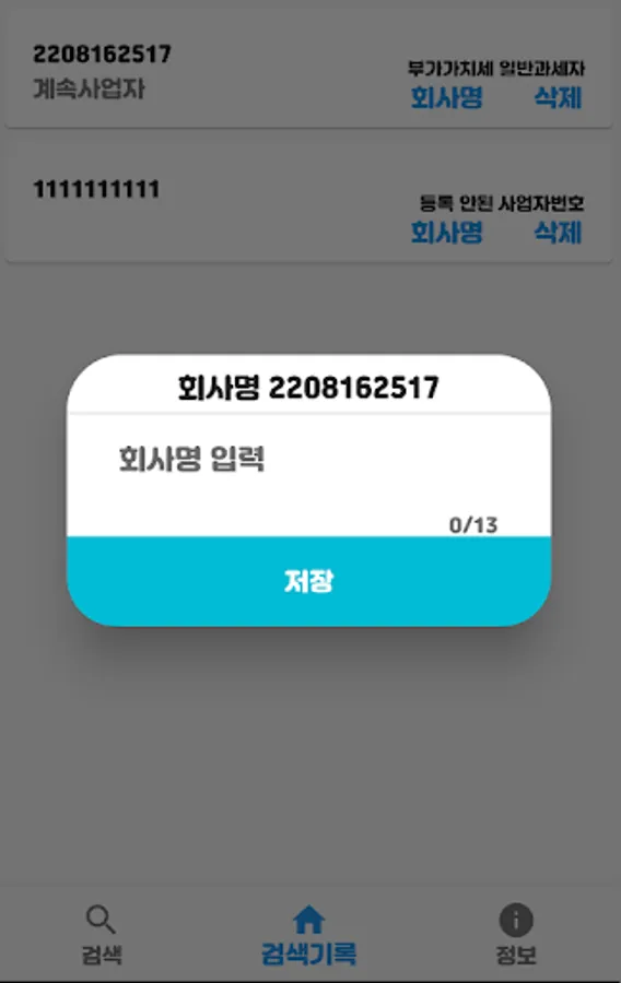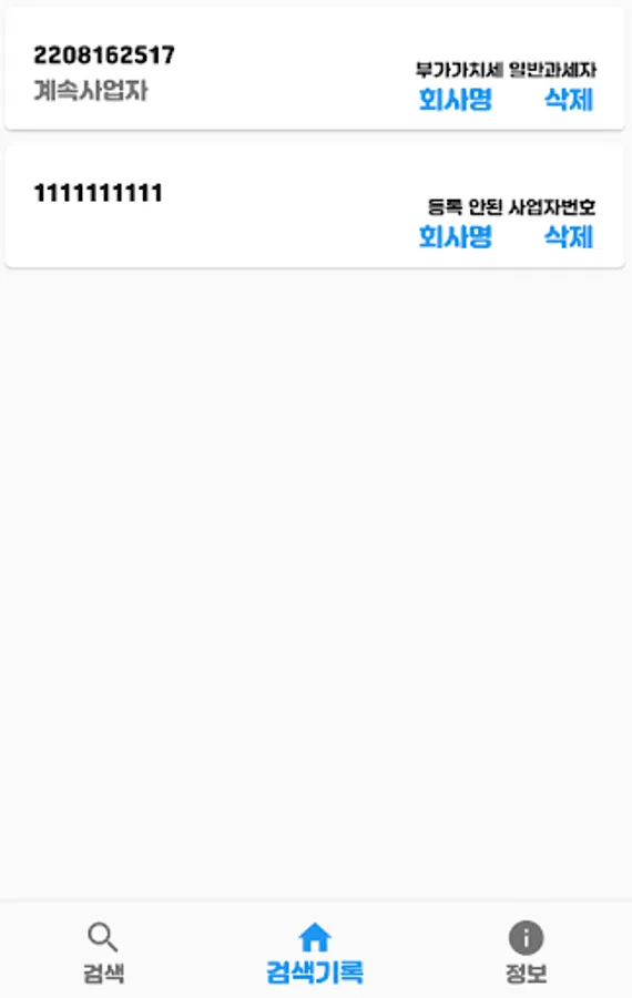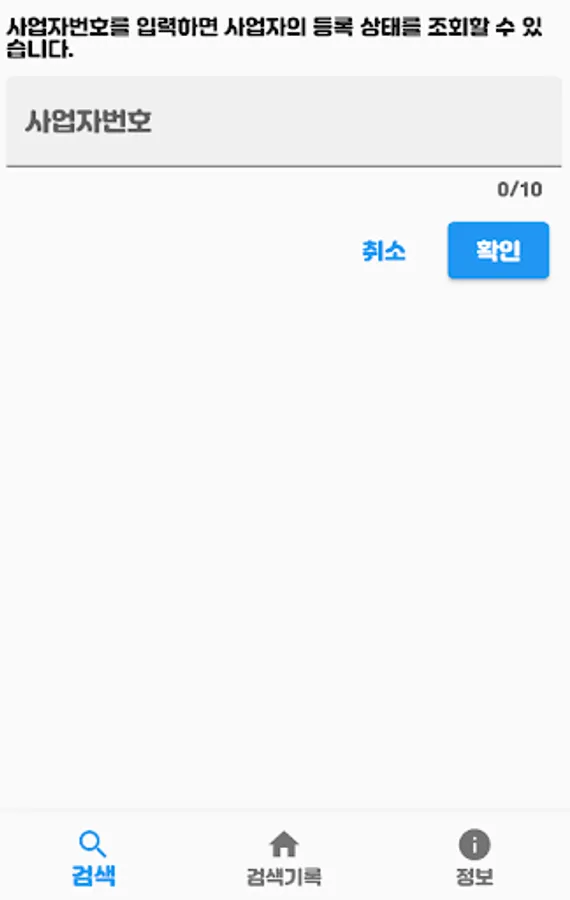 You can check the registration status of the business number by entering the business number. You can check the authenticity of the business number of the customer. The past search history is saved in the device and you can enter the business name.