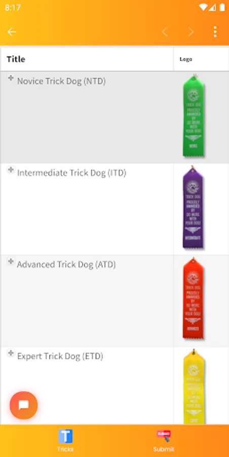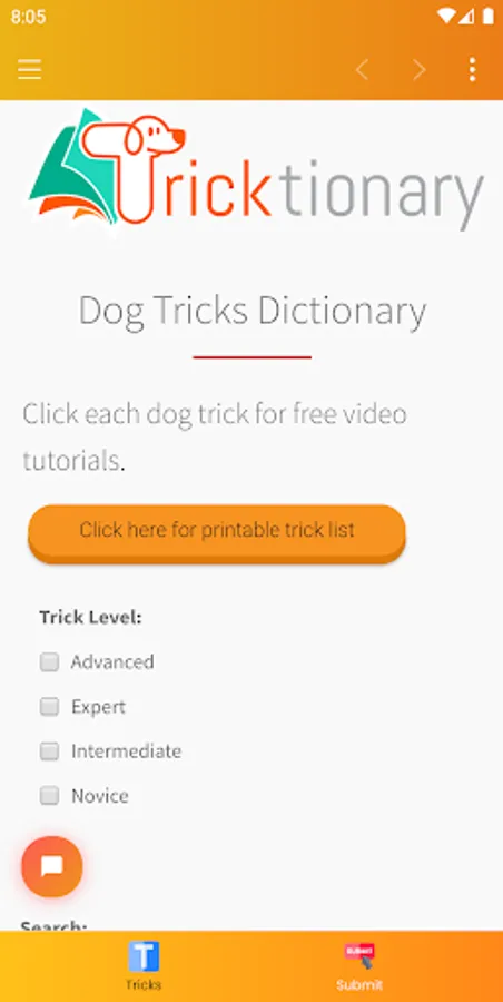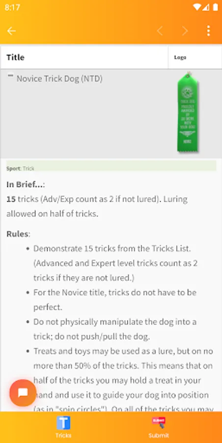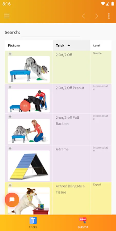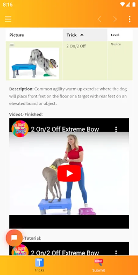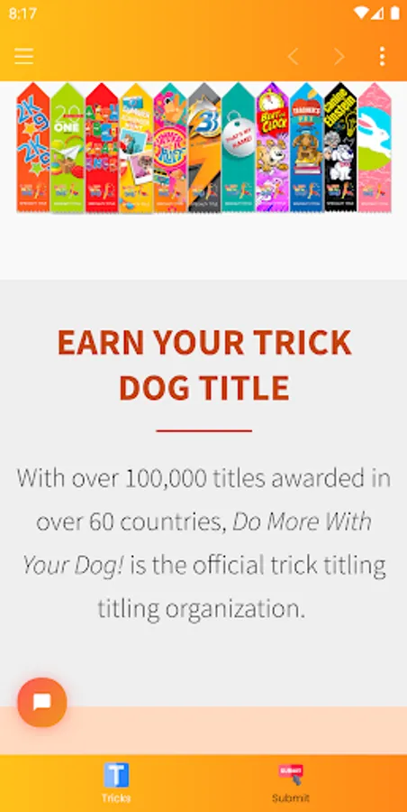 Teach your dog a new trick! The Tricktionary features nearly 300 fun tricks and fitness activities. Each trick has a difficulty level, a description, a video of the finished trick, and a tutorial video. Earn your dog's "Novice Trick Dog" title by using this app to upload video of 15 Novice level tricks. Ready for more? We have 44 titles you can earn in sports such as Tricks, Fitness, Stunt Dog live shows, and Animal Acting.