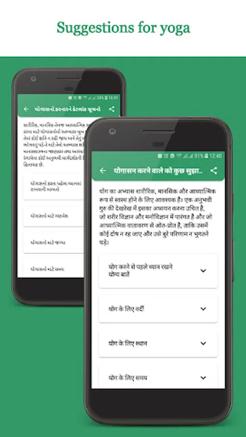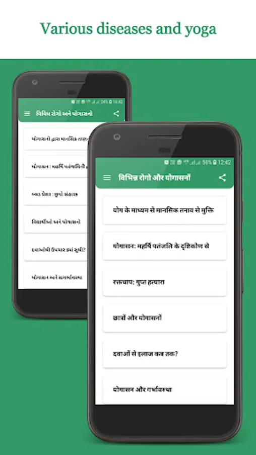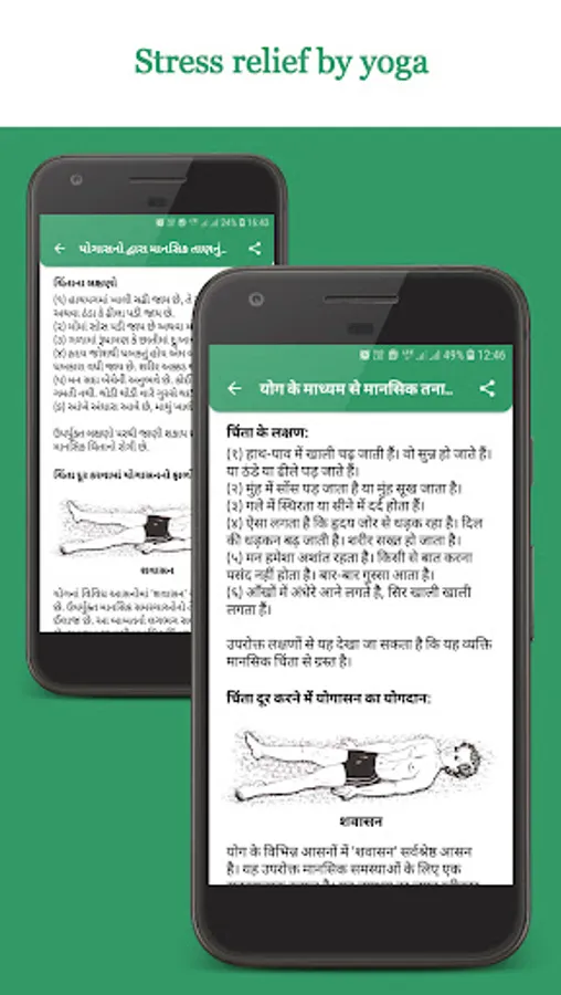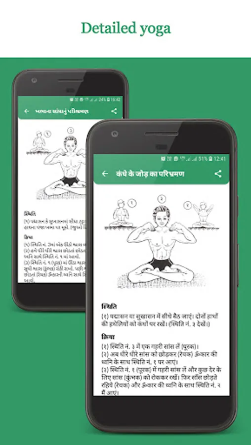 In this application complete information of each asana is given such as meaning of asana, its position, action, instruction, special note, benefit etc.