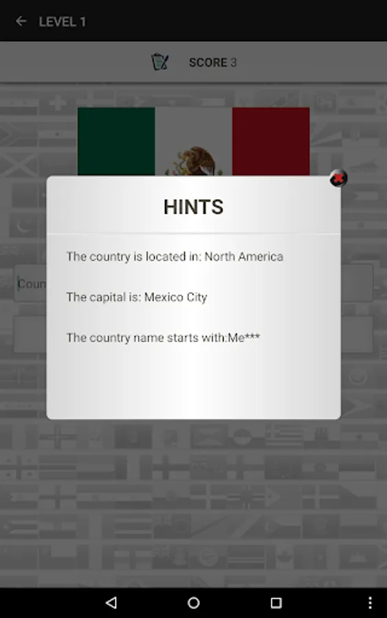 1. Normal game mode: guess flag without time limit, three hints that will help you find the country plus once you guess the country more information about the country will be shown.