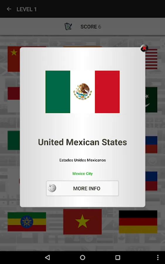 Refresh your memory with knowledge about flags of countries around the world. This educational game will remind you the difference between the flag of Italy and flag of Ireland, flag of Russia and flag of Netherlands. You will learn the flag of countries like Trinidad and Tobago, Gabon and Latvia. You will also learn that Czechoslovakia is now Czech and Slovak Republic. There is a lot of information that can be read about countries around the world from this very friendly game.
