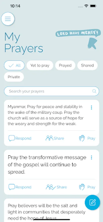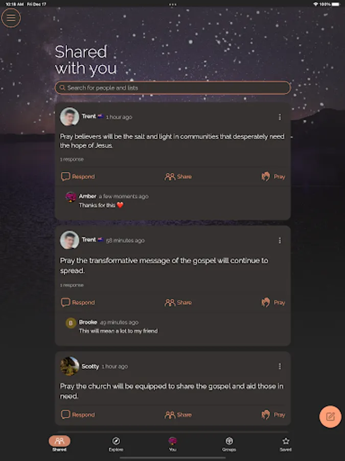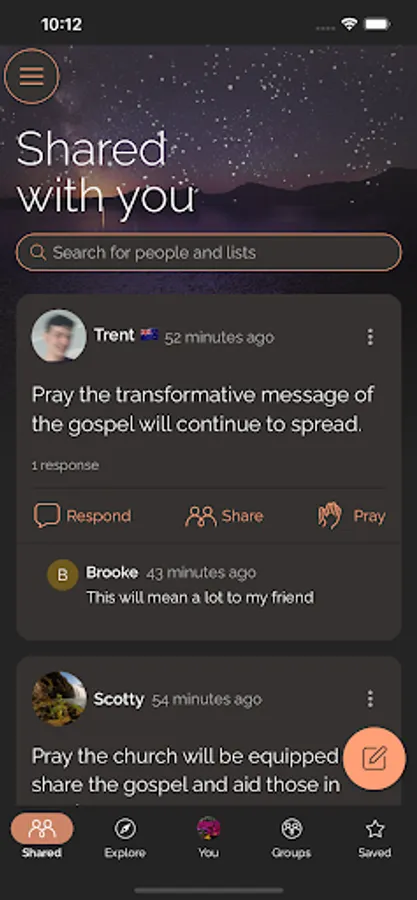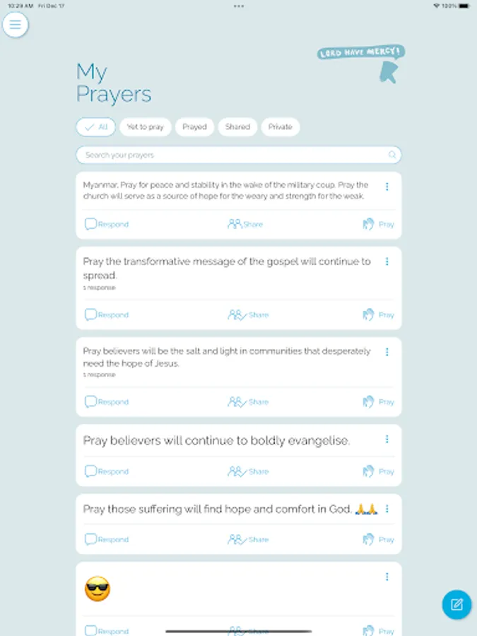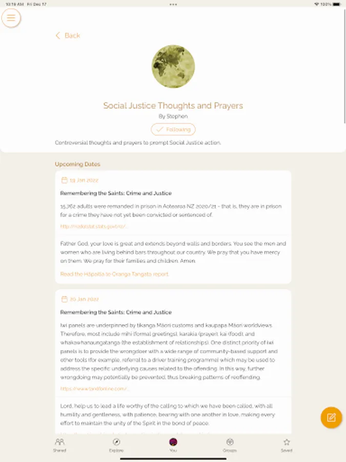 Tuia is your daily prayer app. Tuia gathers people in prayer and reminds us that though we may be scattered (distant physically), we are one in prayer. For this purpose, the main features of Tuia are brought together in Daily Devotions, which weaves together Daily Devotions with Bible readings, your personal prayer list, shared prayers and more.