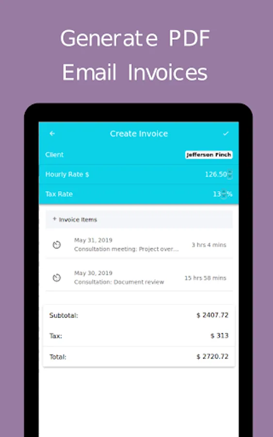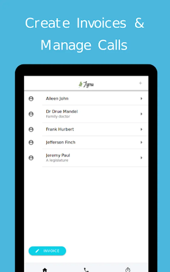 Perfect for lawyers and consultants, save time with Tyme. Made to send your invoices, calculate calls down to the millisecond easily, generate PDF's and email invoices quickly and easily. Manage your calls and meetings with your clients easily.