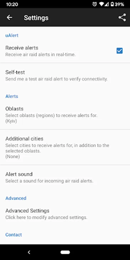uAlert provides real-time notifications of air raids in Ukraine, as reported by official Ukrainian regional administrations (data source: https://ukrainealarm.com).