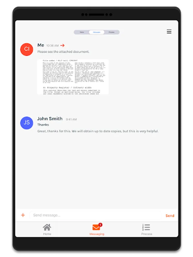 • Communicate with your solicitor or conveyancer 24/7 by sending messages and documents whenever you like. All your conversations are stored securely in the app, so nothing gets lost.