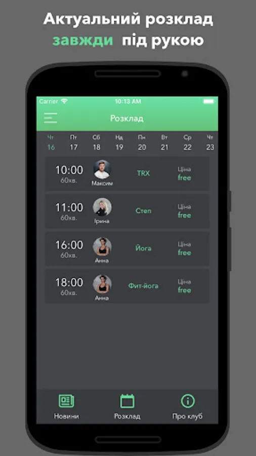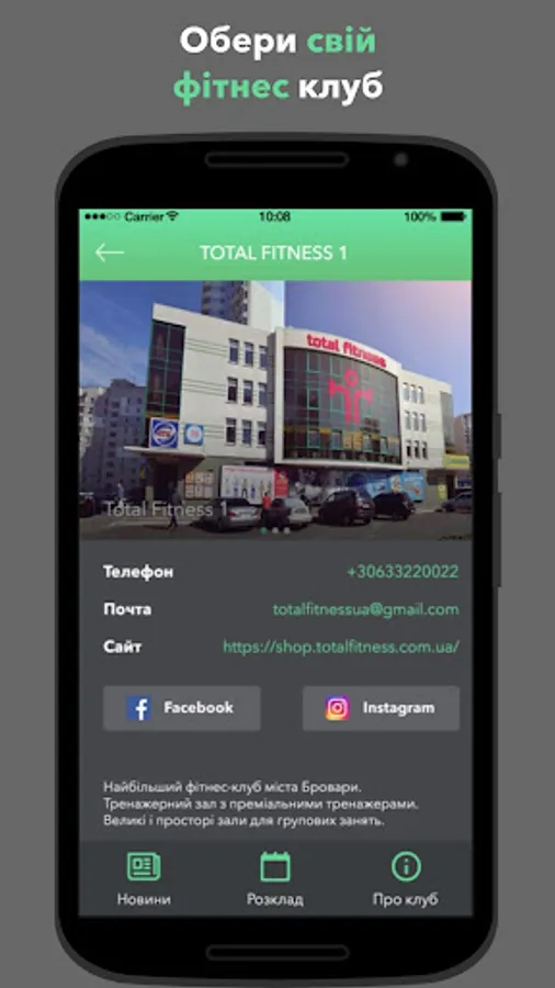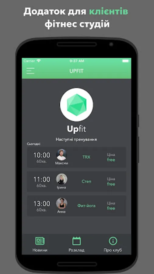 UpFit is a Ukrainian application for fitness clubs, yoga studios, solos, martial arts, and more.