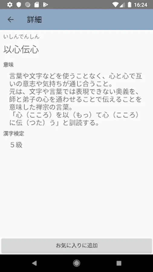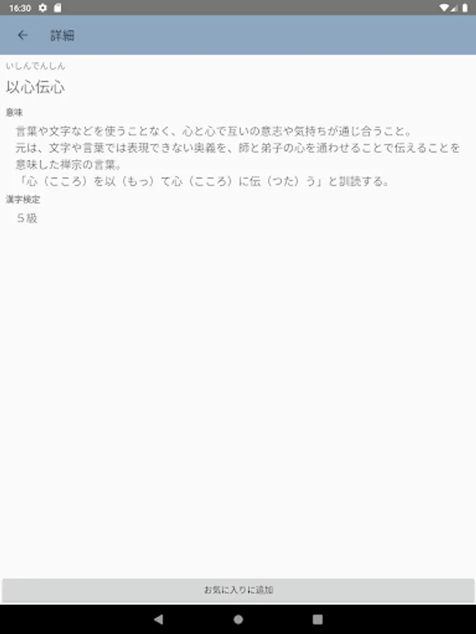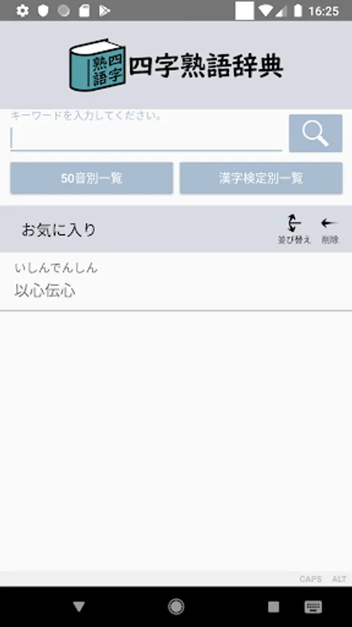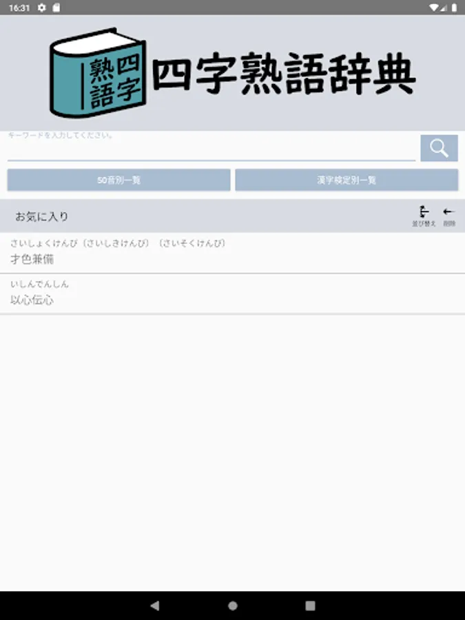 圧倒的な収録数の四字熟語を収録。無料なのに6300以上の四字熟語を収録。キーワードでの検索、50音別または、漢字検定の級別に四字熟語を学べます。