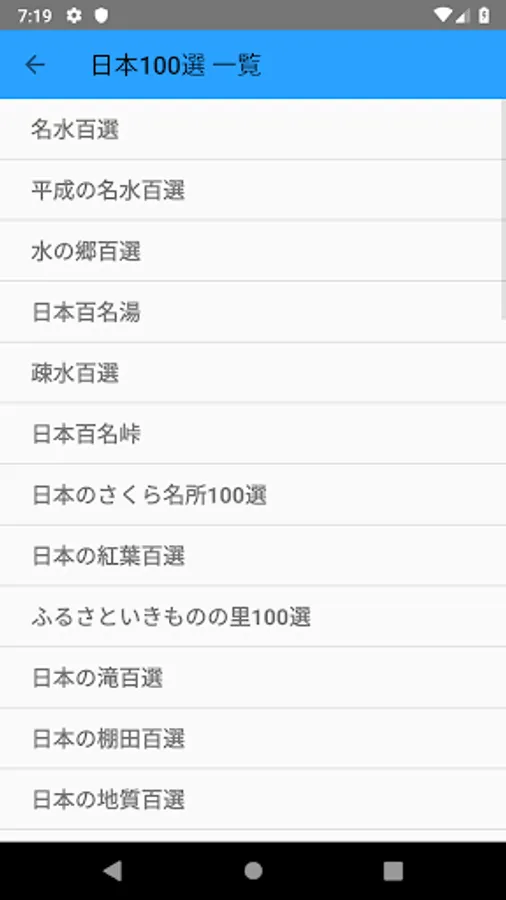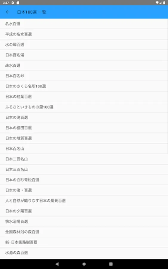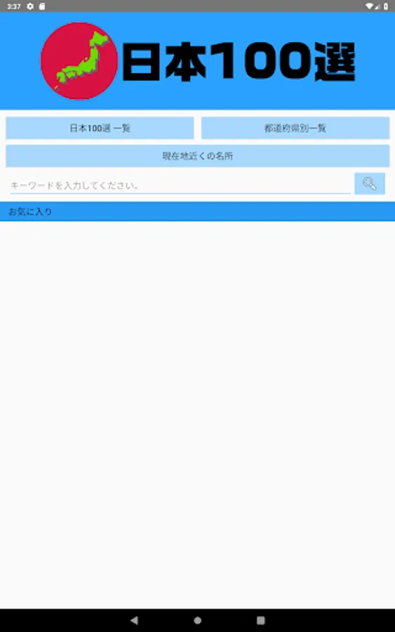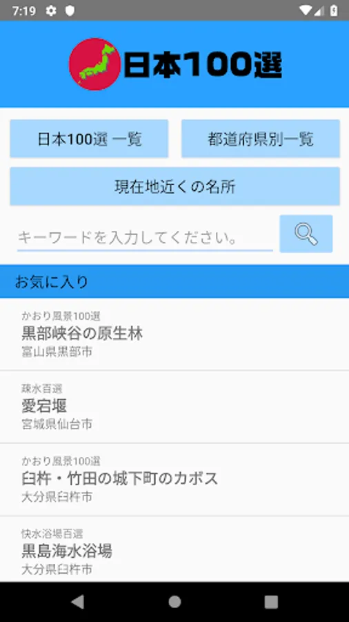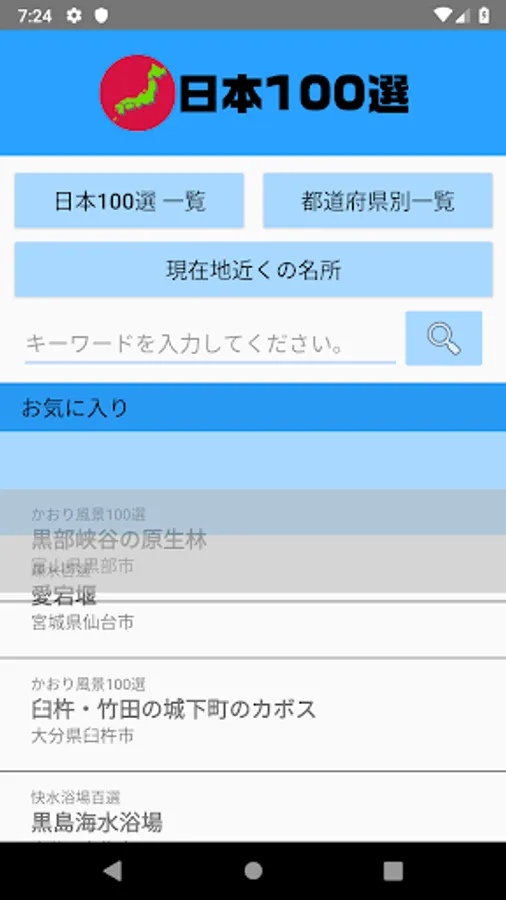 You can search and display information on more than 40 selected 100 selections from all over Japan and more than 4000 famous places. You can perform 100 selections, by prefecture, famous places around your current location, and keyword search.
