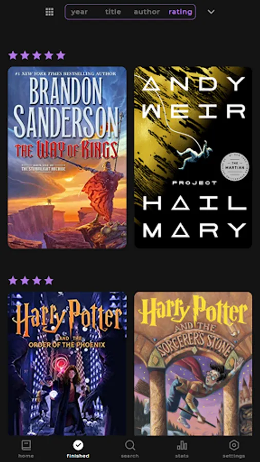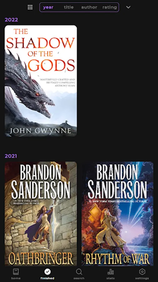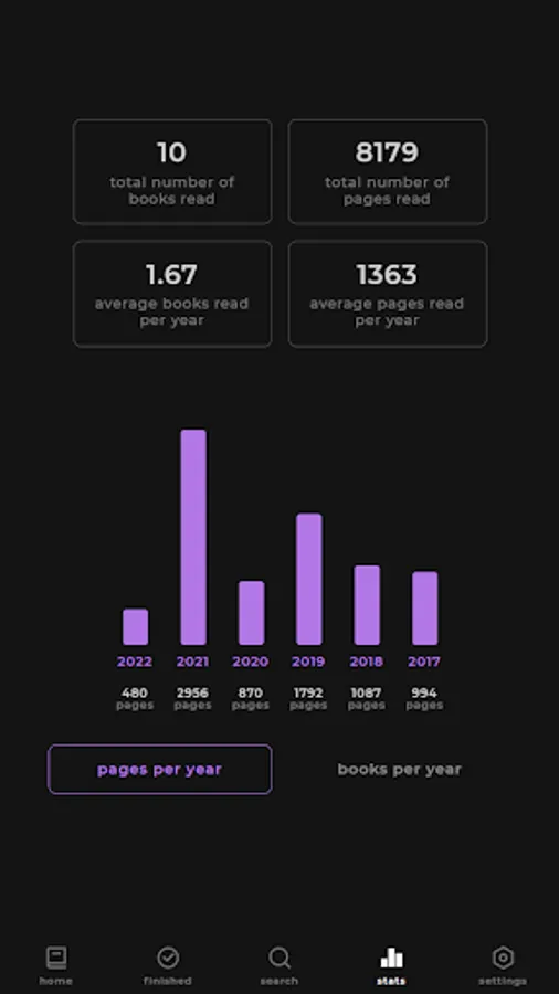 View stats like how many books you have read in total or the average number of pages you read per year.