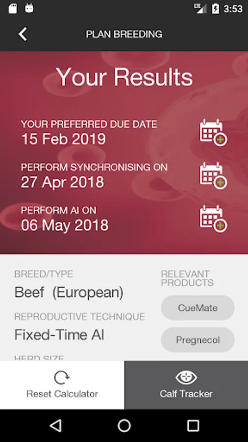 Whether you want to know when your cows will calve, or to calculate when to run a reproduction program, this app can help. If you want your herd to calve around a specific time, use this app to help you plan when your cows or heifers need to be inseminated or placed with bulls, and when to administer synchronisation protocols to get the best results. Be guided through the process to predict the due date of your calves – whether you are calculating for a herd or a single female.