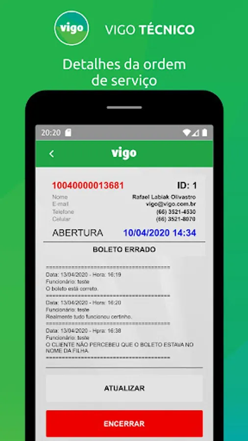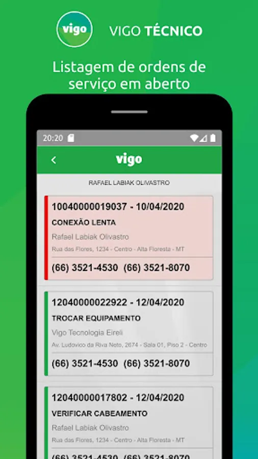 Application for the technician of the internet provider, integrated to the VigoWEB System, allowing him to manage the service orders under his responsibility, being able to perform the following actions: