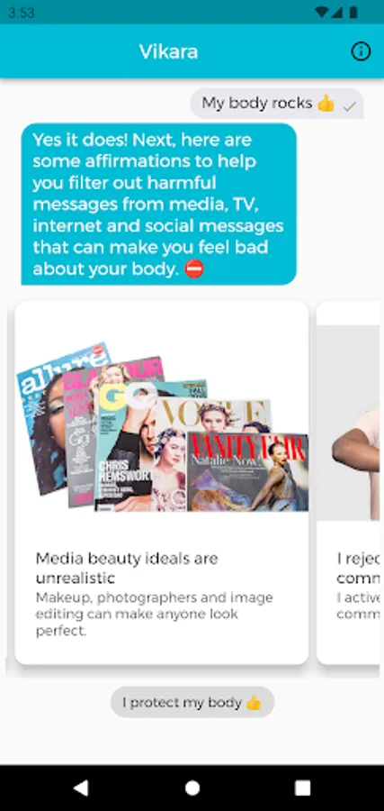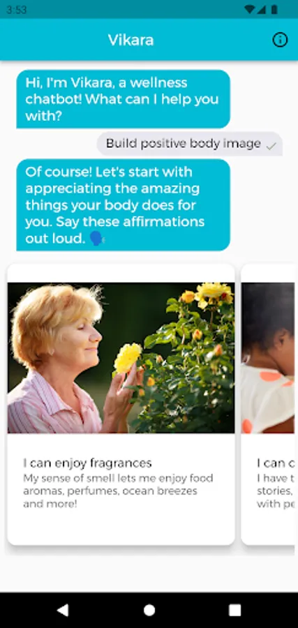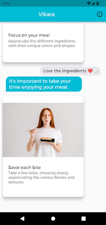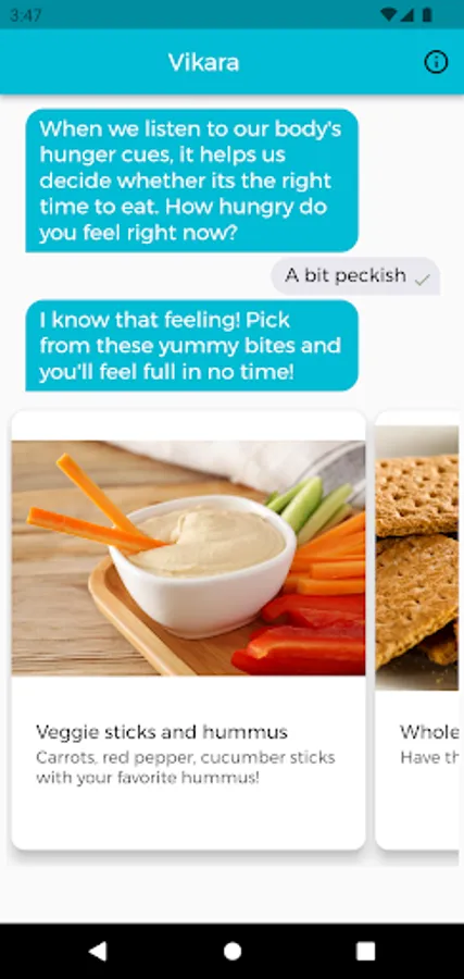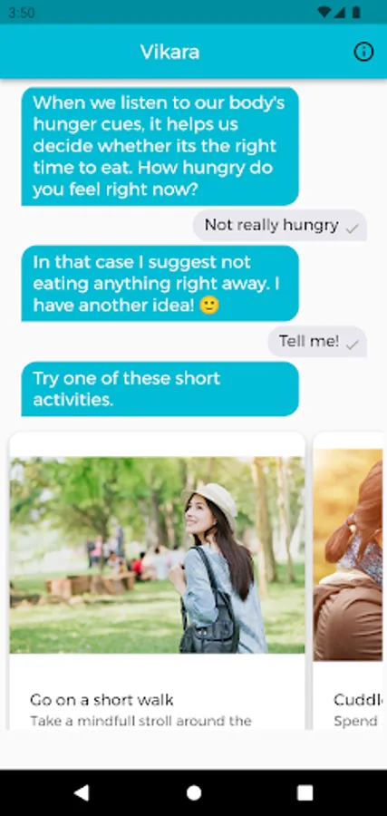 Do you find yourself overeating or binge eating? Do you have body image issues? Vikara is a friendly chatbot that helps prevent overeating, curb binge eating and build a positive body image. Vikara uses mindful eating practices and cognitive behavior therapy techniques to remove psychological inhibitors to weight-loss and prevent eating disorders. Vikara is free, confidential and asks for no personal information.
