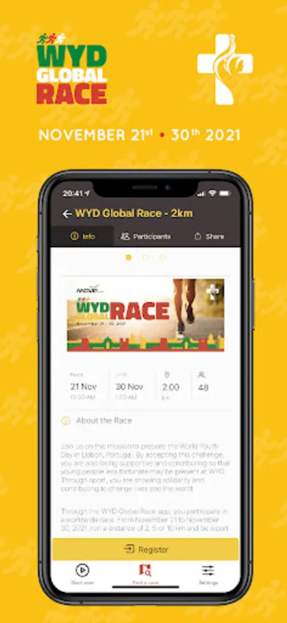 Immediately after registering, you will be taken to the international event feed. From here you can register for virtual runs or challenges in just a few steps. These are either started at a predefined start time by all participants at the same time or the start time can be freely selected within a certain time window. Live updates via headphones keep you informed about the race (countdown to the start, remaining distance, intermediate positions, results of the marked favourites, ...) and motivate you to achieve your best performance. Timing, distance measurement, start and finish - everything is handled directly by the app.