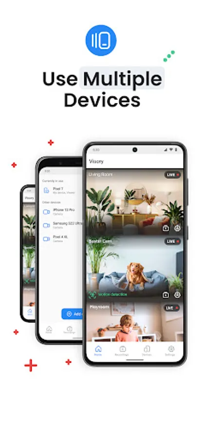 Visory Security is a CCTV camera on mobile for incredible home protection or dog /pet care. Use it as your nanny cam, pet monitor, and even CCTV camera recorder or night video camera for your IP cam security system. To use it as a video elderly monitor or dog monitor for live streams, you need to link together at least two devices (smartphones or tablets) – one for capturing a video and one for watching it.