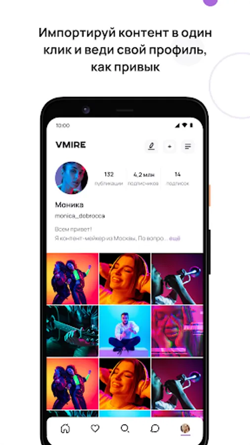 VMIRE is a new social network for communication, making friends, expressing yourself and sharing photos and videos. Take photos and videos, create stories, clips, posts and share them with your friends. In the VMIRE social network you will find your favorite stories (stories), rils (short video clips) and posts (publications). Just open the WMIRE app, create your own unique content and wait for the reactions. Find new acquaintances and be in touch with your subscribers!