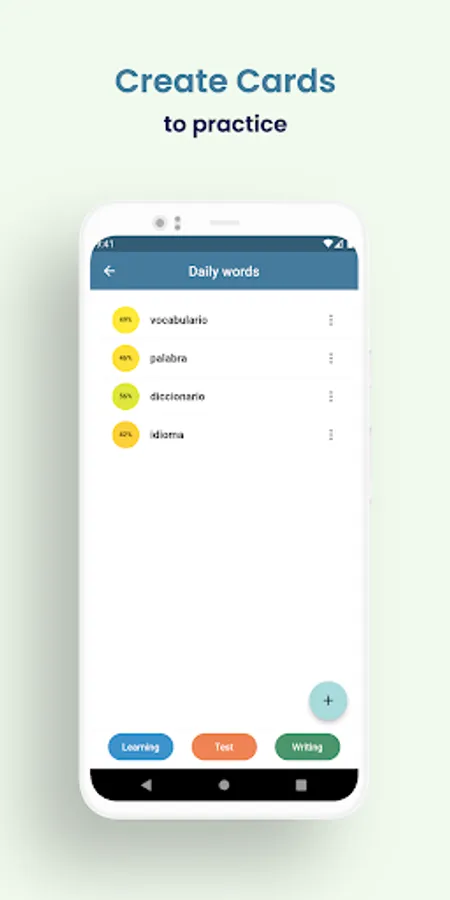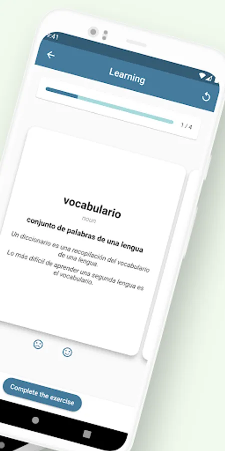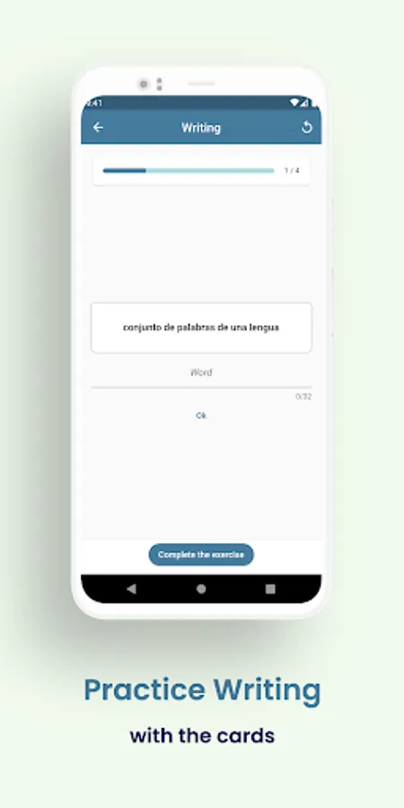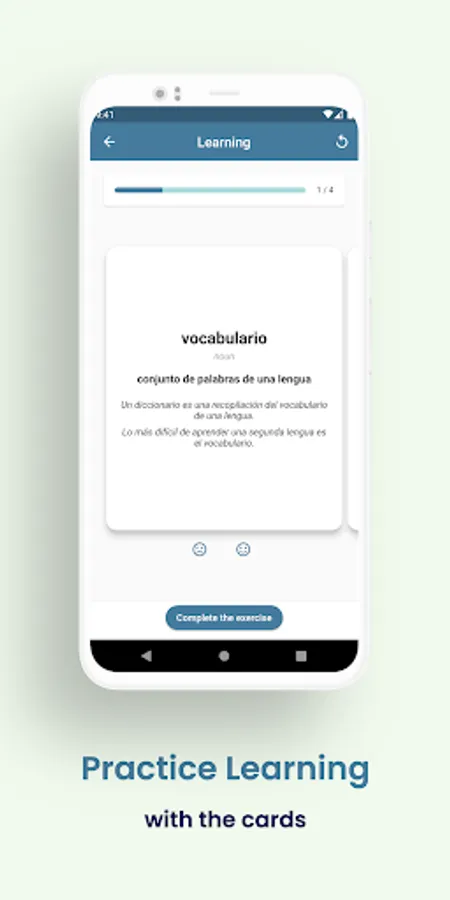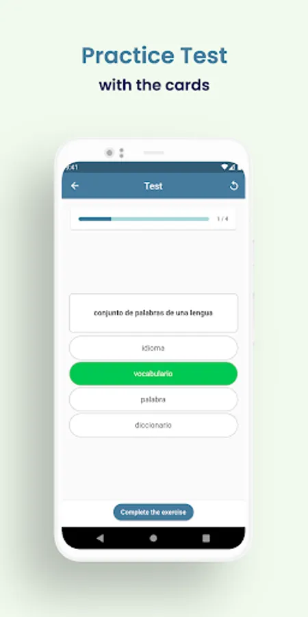 You can do exercises with the cards in the deck. There are 3 types of exercise. Try to guess the word by looking at the definition with the learning exercise, try to choose the right word among 4 options by looking at the definition with the test exercise and try to write the word correctly by looking at the definition with the writing exercise.