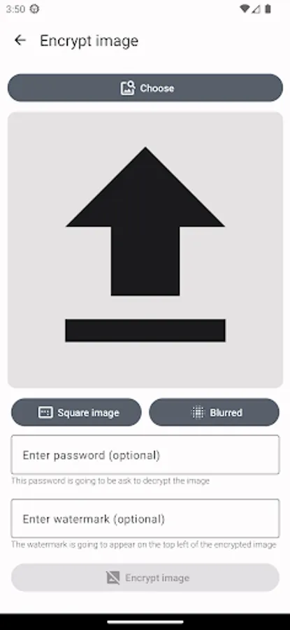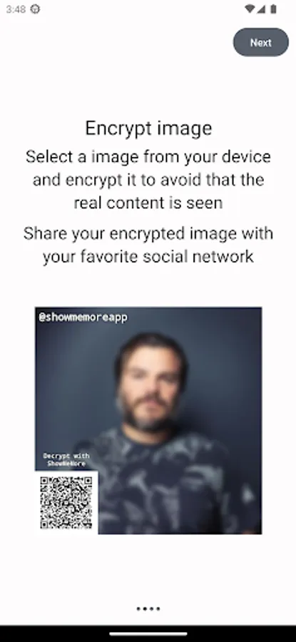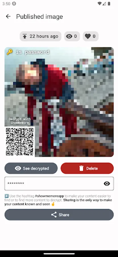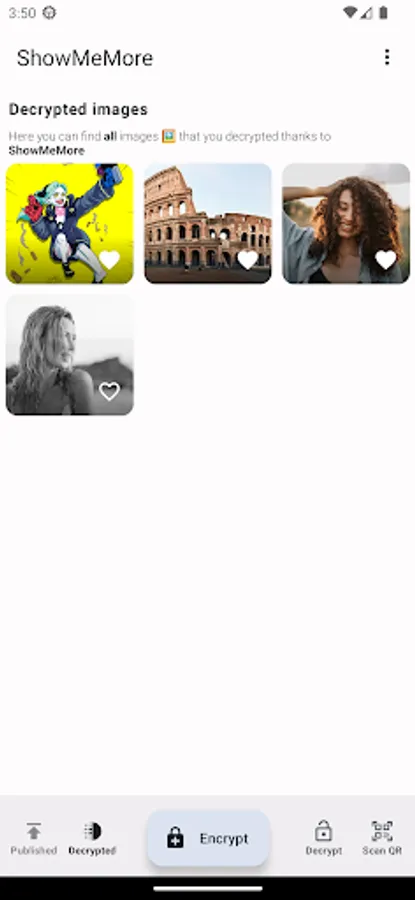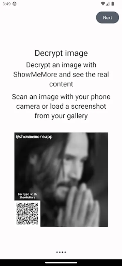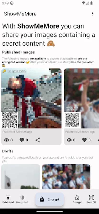 The app allows you to encrypt an image with a secret content. The encryption obscures the image providing a unique qr code and to open it you need to use the app.
