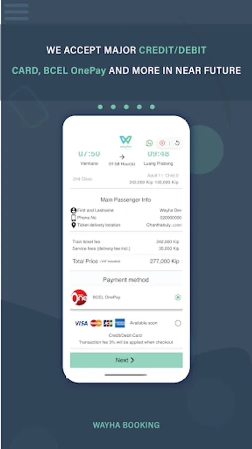 - you can pay for a ticket with an international Credit/Debit card, BCEL One Pay, and other payment methods will be available in the next update.