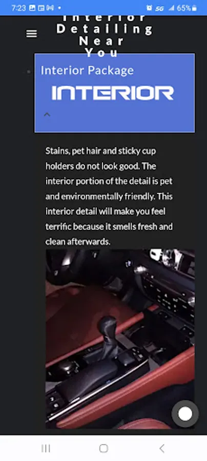 Interior-blowout, vacuum, brush carpets, stain spot, stain treat, pet hair, under seats, between seats, seats, carpet, dashboard, steering wheel, windows, vents, dials, knobs, cup holders, threshold, mats, headliner, steam clean and condition.