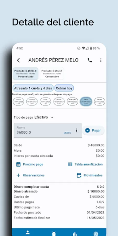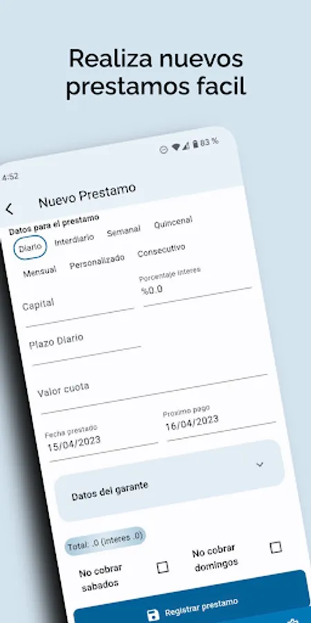 -Create clients in various modalities, such as daily, interday, weekly, biweekly, monthly, personalized, consecutive (Only charge interest or capital)