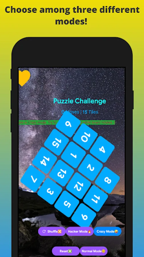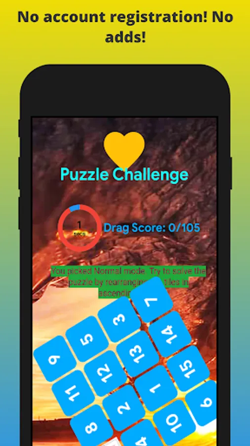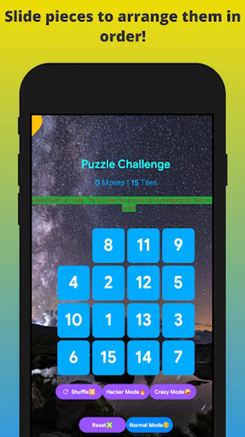 - Normal mode: Arrange pieces in order to solve the puzzle