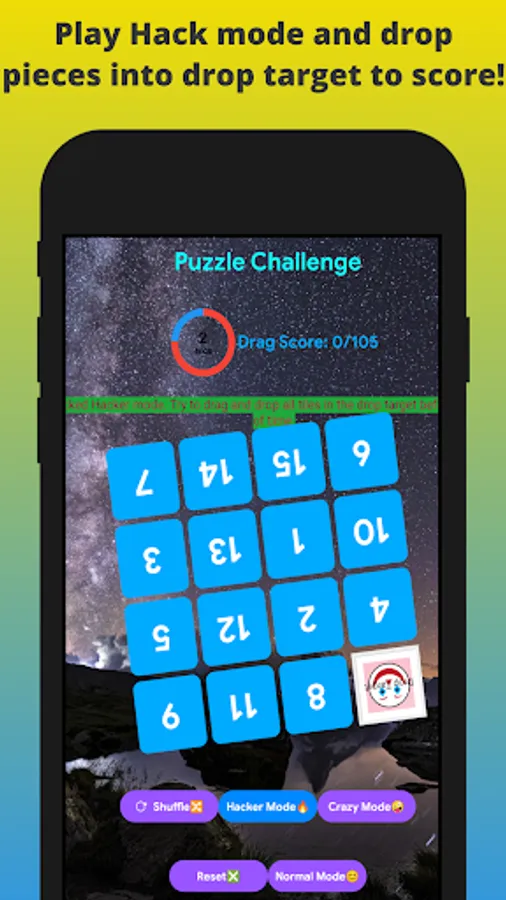 - Hack mode: Drag pieces into drop target to score. Finish them all before you run out of time!