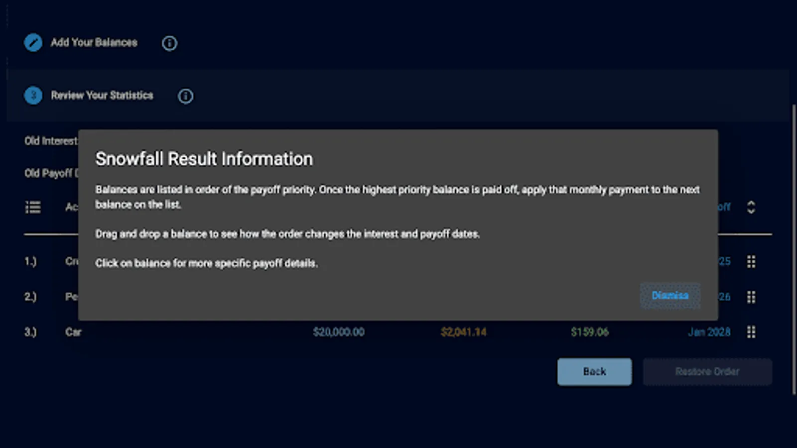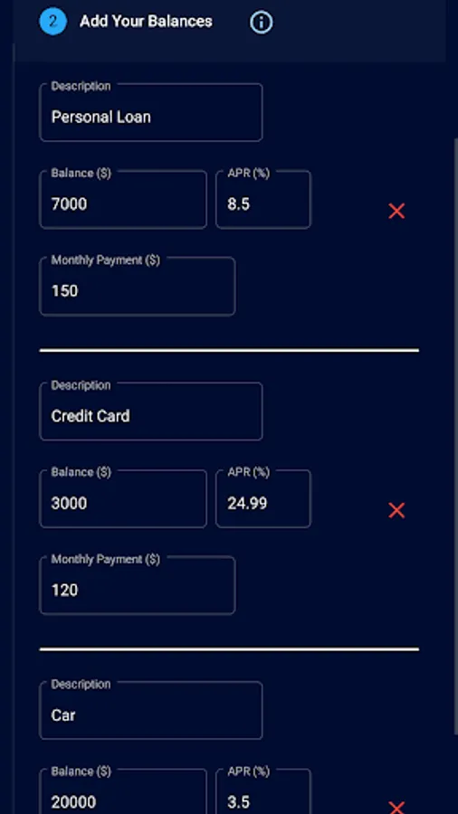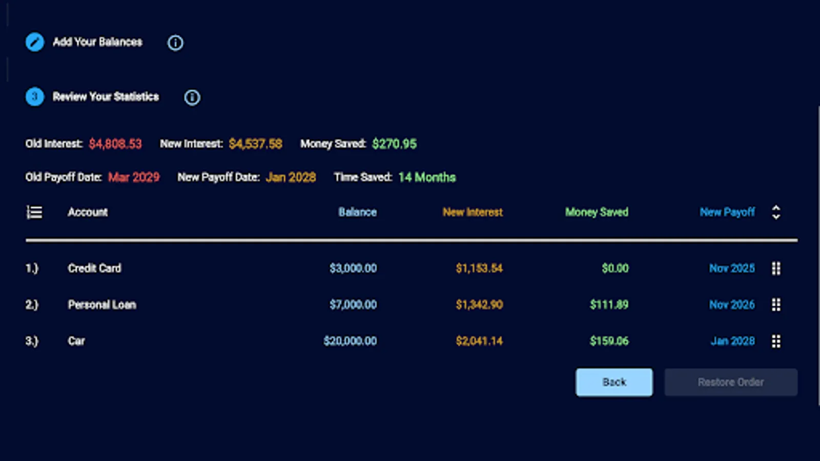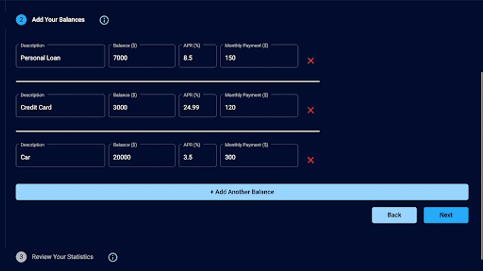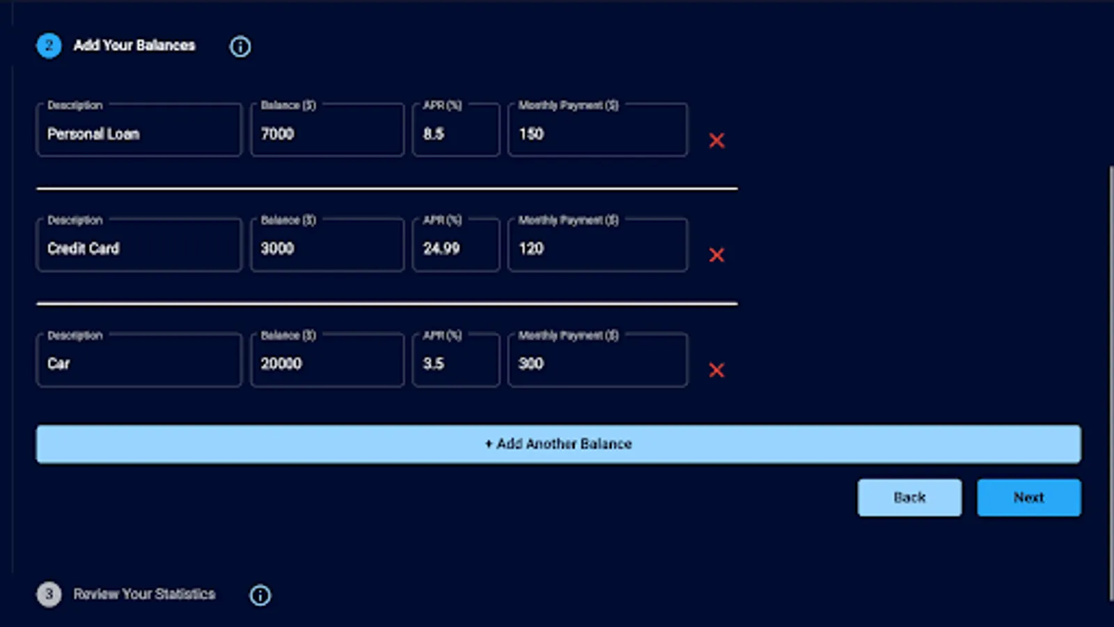 The process is simple. Input any current or perspective balances information. Including the amount, the monthly payment, and the annual percentage rate (APR). Then review your stats!