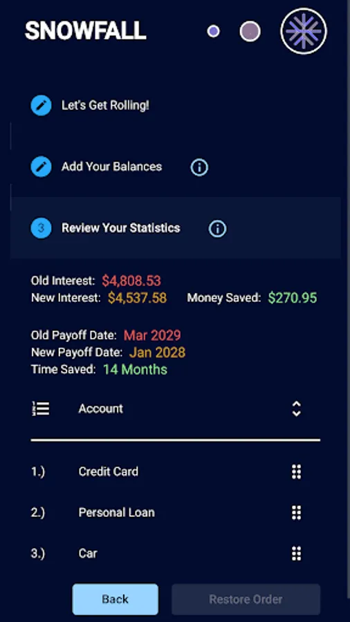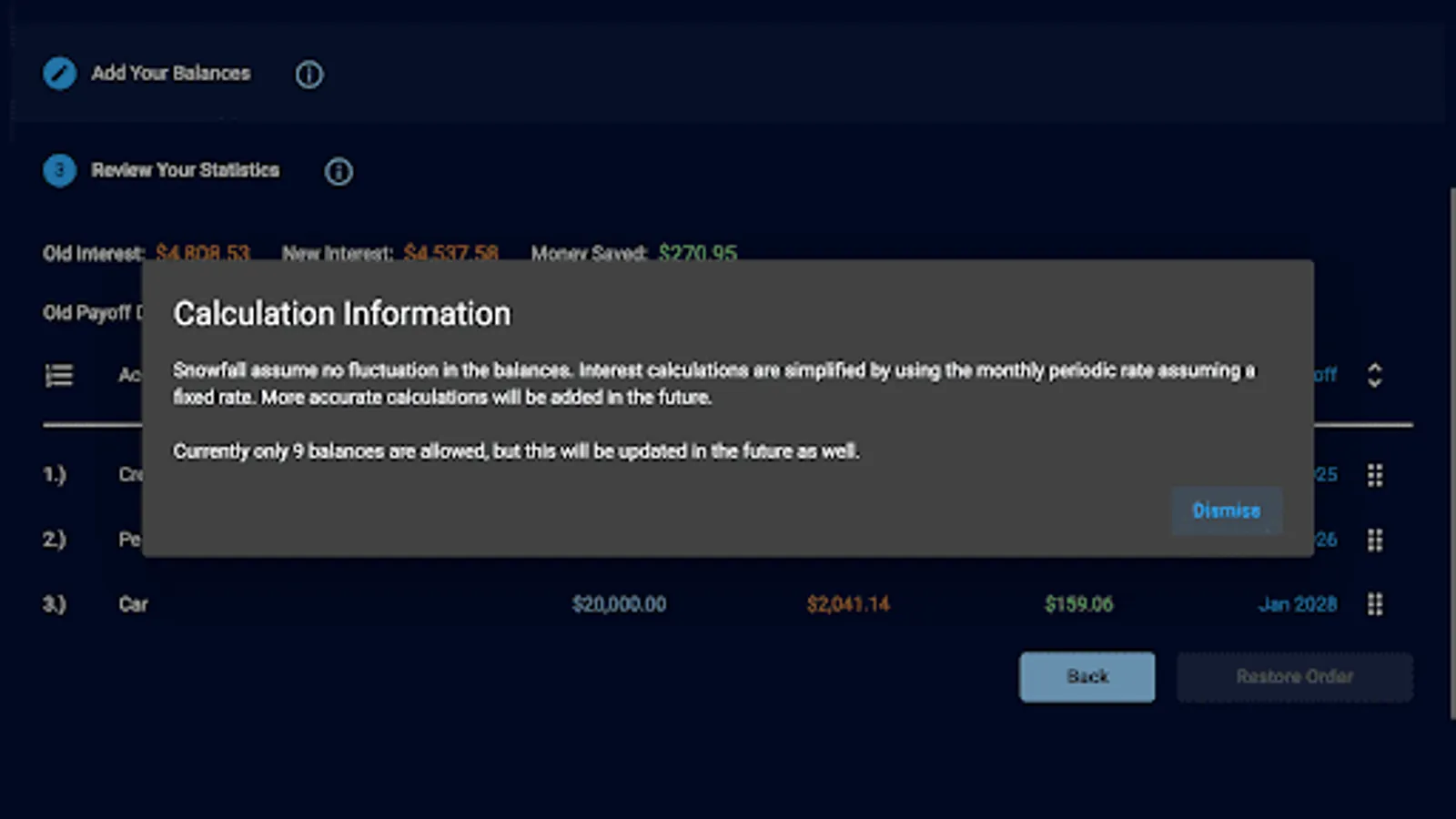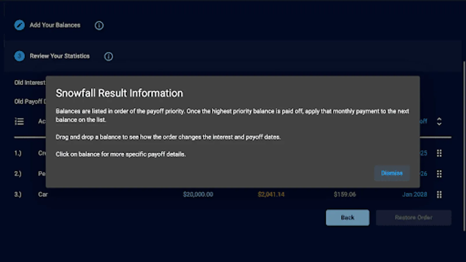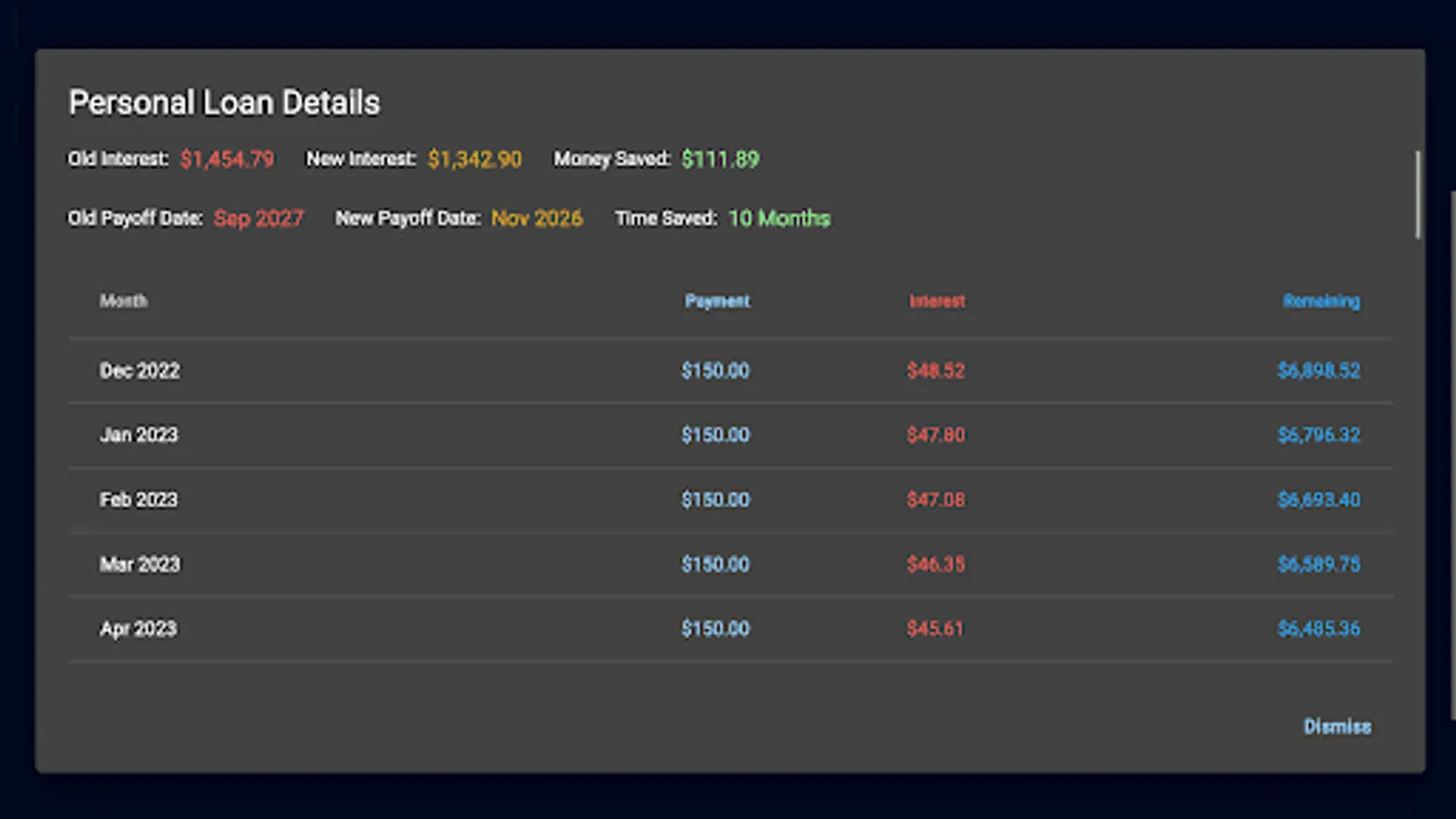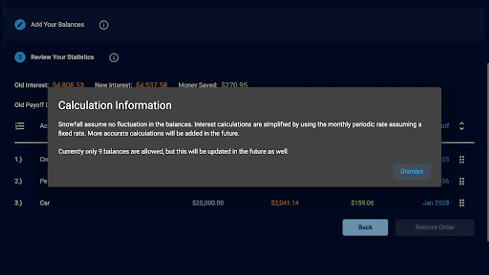 The process is simple. Input any current or perspective balances information. Including the amount, the monthly payment, and the annual percentage rate (APR). Then review your stats!