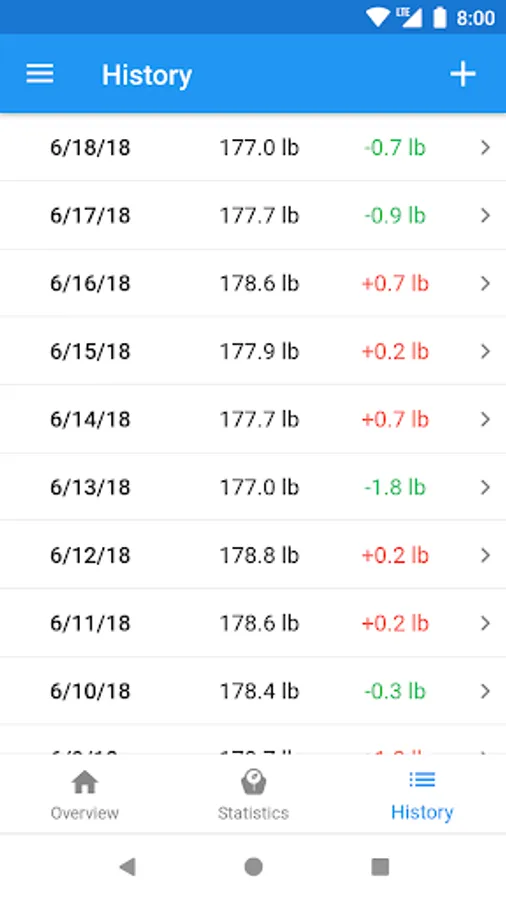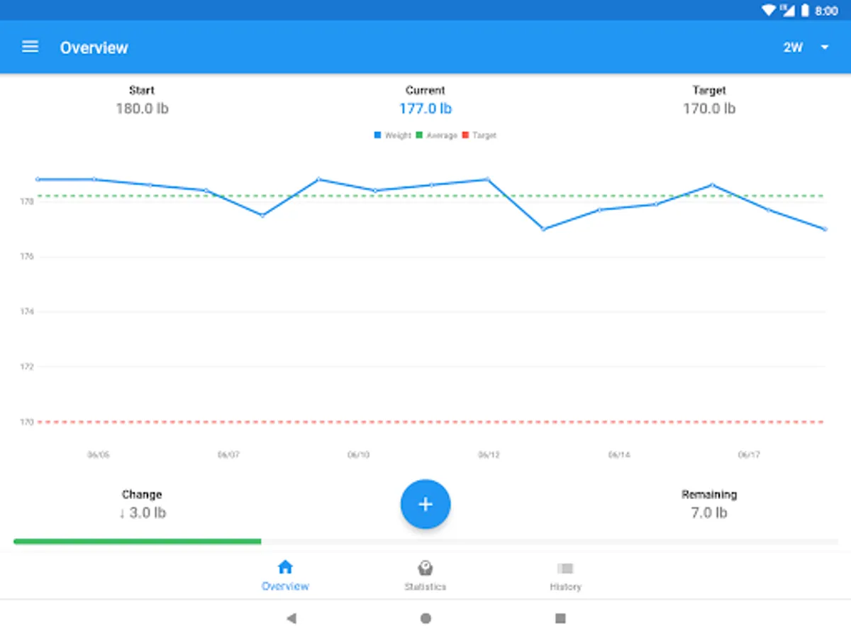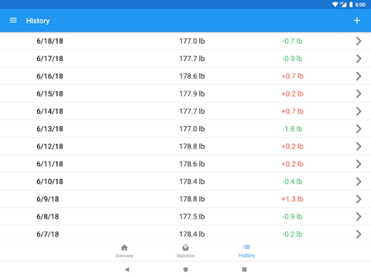 • Take a look on statistics about your weight, i.e. average weight, Body Mass Index (BMI), difference to the starting weight and even more.