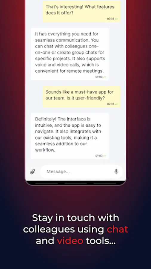 Chat with colleagues one-to-one, or in group chats that include file sharing and voice note capabilities.