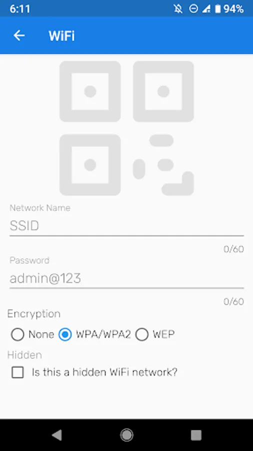 WiFi QR Code shower - QR code generator for wifi without password or no password. when you scan the QrCode you will see the WIFI details of the network name and WIFI password. Use this wifi QR code shower whenever you need to show the wifi password. Show the wifi QR code to your beloved ones to connect to any wifi network with the password. Our wifi QR code shower app is free and feature-rich, easy to use, and convenient. Enter the wifi details like username or SSID and password then press generate button to show the wifi in the QR code image. Let's share the Wifi QR code with your friends or relatives easily. Qr code scanner for the wifi password.