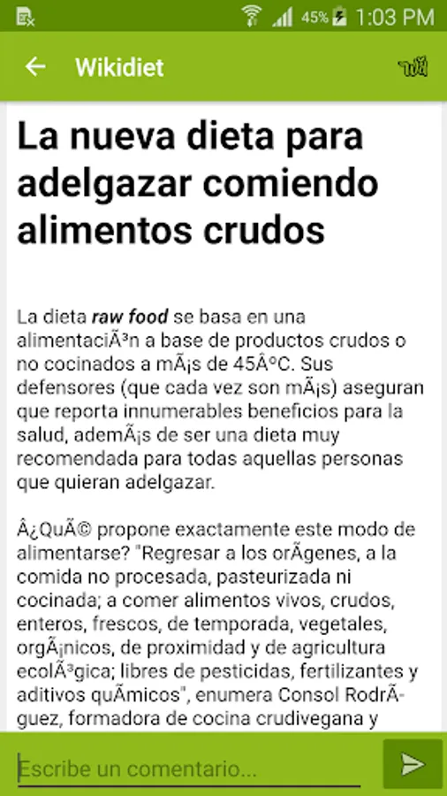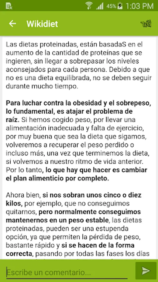 "WikiDiet" - Eating and reaching your goals to be healthy has never been so easy with this app. Find out here the best diets to have a perfect nutrition and so you can be in balance with your body. Lose weight and keep fit eating healthy, rich and without so many sacrifices. Here you will get motivation to lose those extra kilos and not eat junk food.