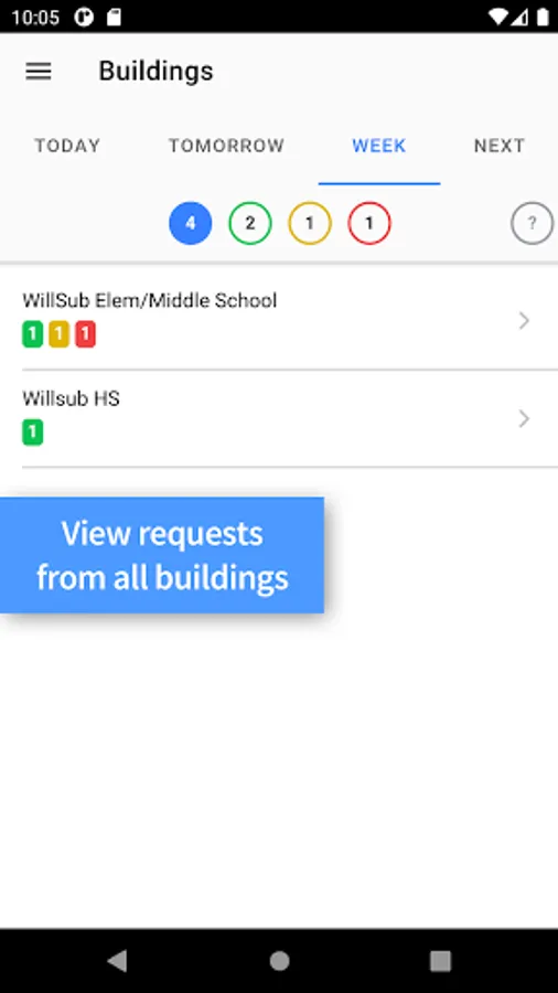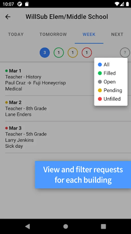 • View and filter filled, open, pending and unfilled time off requests for each building.