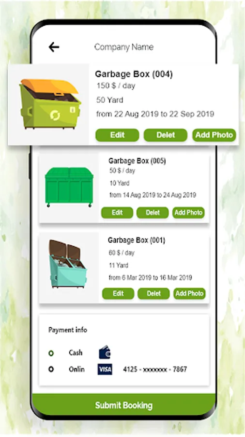Application contain two integrated application on smartphones to deal with the target group of (factories - hospitals - Companies - warehouses, etc.) To provide container booking service for garbage collection The application features a basic control panel for the application manager through which officials can add the description of containers and companies and their addresses It also features a sub-control panel for companies characterized by ease The advantages of the mobile application containers sent to the client and thus save him a lot of effort and time