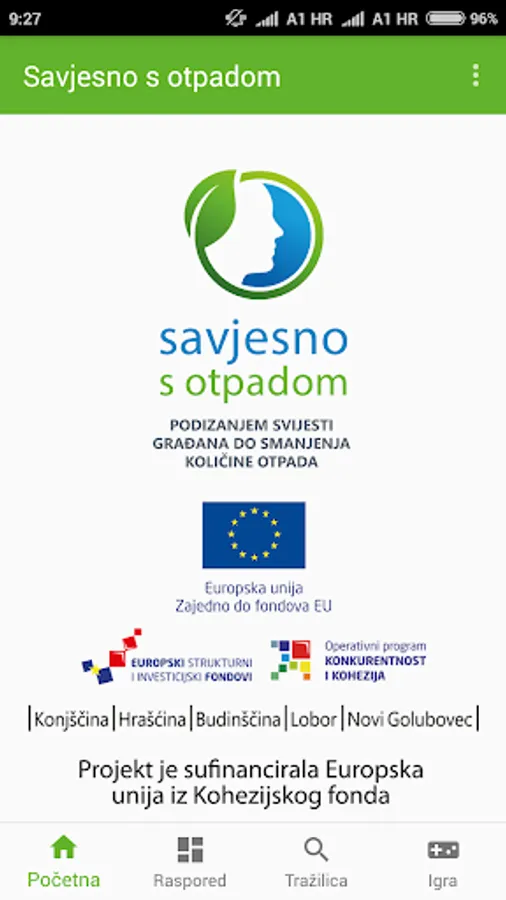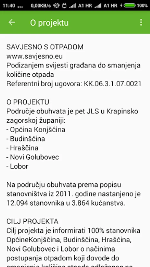 The aim of the project is to inform 100% of the inhabitants of the Municipality of Kostunica, Budinščina, Hrašćina, Novi Golubovec and Lobor on waste management methods that lead to a reduction in the amount of waste landfilled into landfills through 5 mandatory and 7 recommended educational and information activities. Along with the informative activities the project includes activities of promotion and visibility and project management. The knowledge acquired will be used by citizens to change their everyday habits and to adopt the importance of responsible waste management in the sense of sustainable development of their local environment.