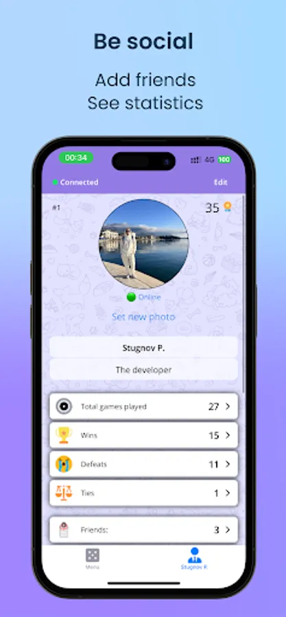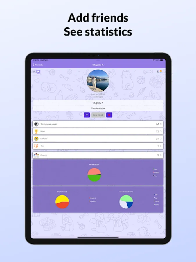 Create your account in the app and customize it to your liking - add a photo and fill out information about yourself so that other players can easily find and connect with you. But if you don't want to share your data, you can play anonymously. You can also add other users as friends and challenge them to a game - find users by name or ID.