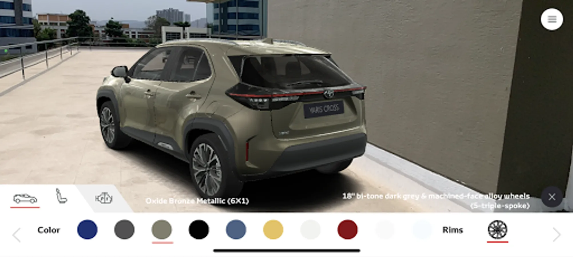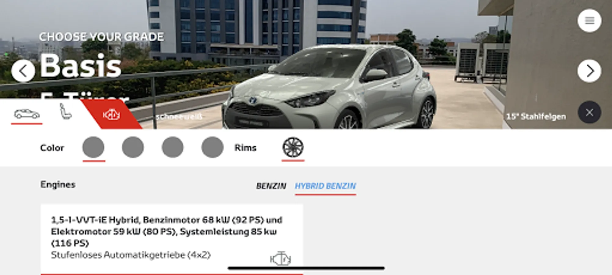 Toyota Augmented Reality App is a new exciting way of personalizing your future Toyota. Configure your perfect Toyota and display it in your garage or your table at the Livingroom. Immerse yourself in the interior and compare all finishes from different angles.