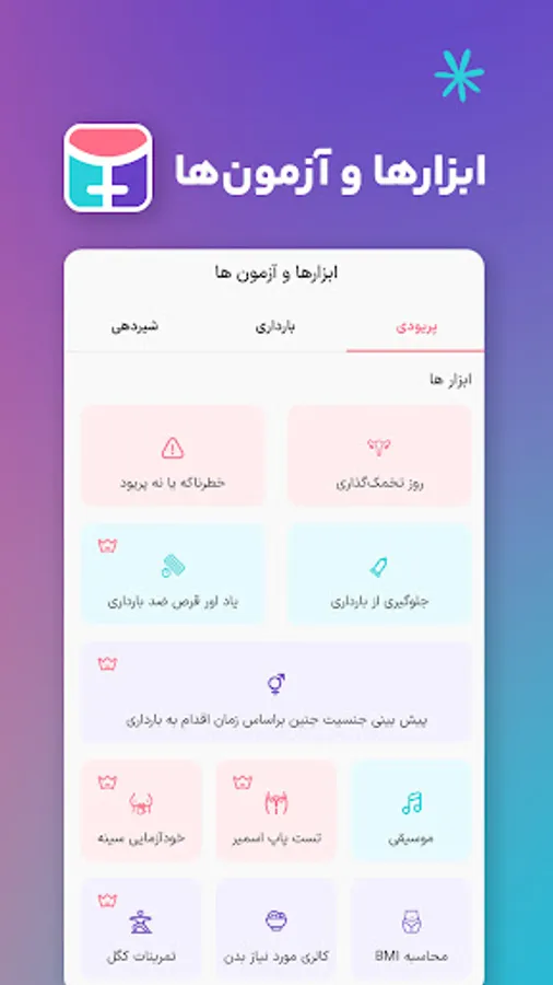 It will help you to record your periodic information and have a daily periodic status report (Circular Period), which can help your specialist to better understand your condition. It also tells you about the time of ovulation that if you are planning a pregnancy you can take these days (fertility days) or if you are planning to have a pregnancy you should be more careful these days.