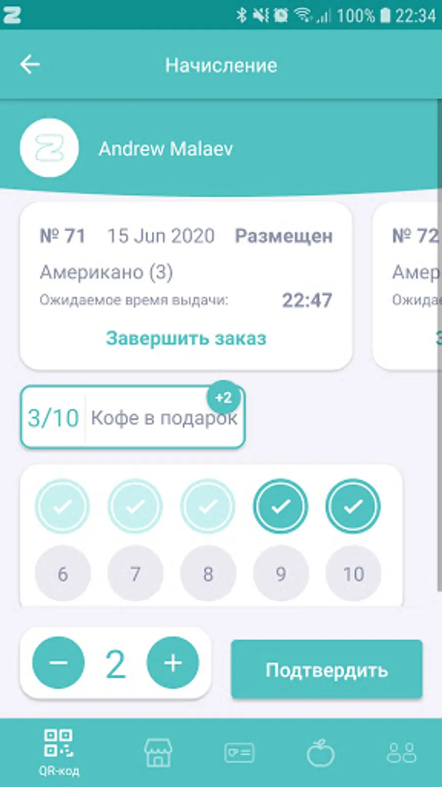 - сканировать qr-код клиента и начислять ему баллы за покупки;