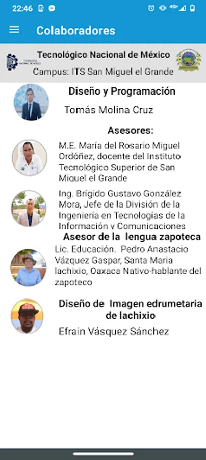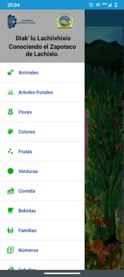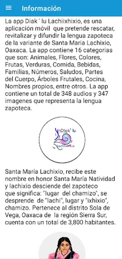 The Diak 'lu Lachiixhixio app is a mobile application that aims to rescue, revitalize and spread the Zapotec language of the Santa María Lachixio variant, Oaxaca. The app contains 16 categories that are: Animals, Flowers, Colors, Fruits, Vegetables, Food, Drinks, Families, Numbers, Greetings, Parts of the Body, Fruit Trees, Kitchen, Personal Pronouns, among others. The app contains a total of 348 audios and 347 images representing the Zapotec language.
