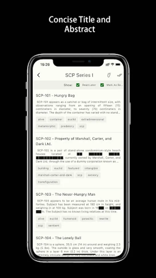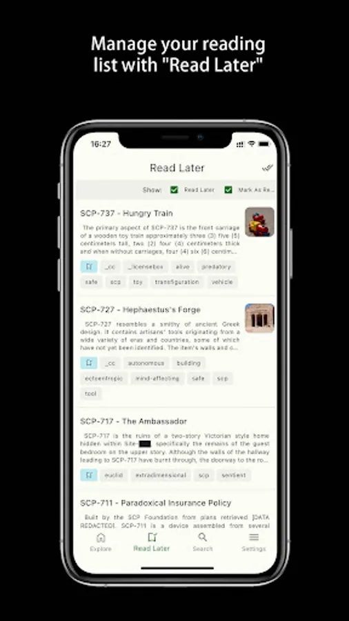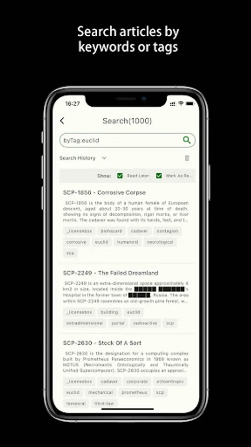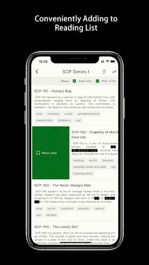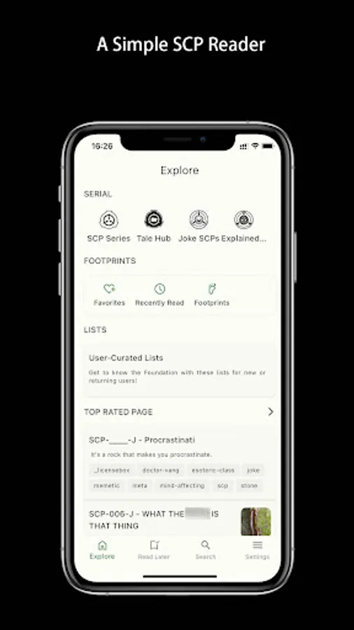 Choose your favorite topic, read your favorite scp articles or add to the to-read list at any time.