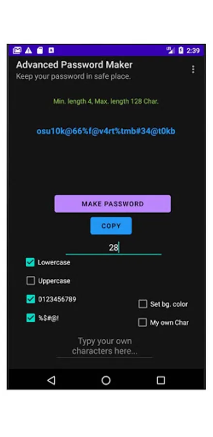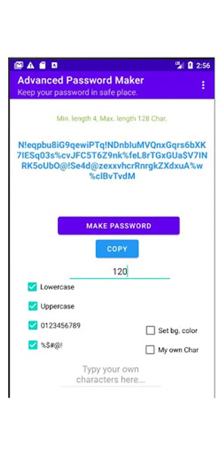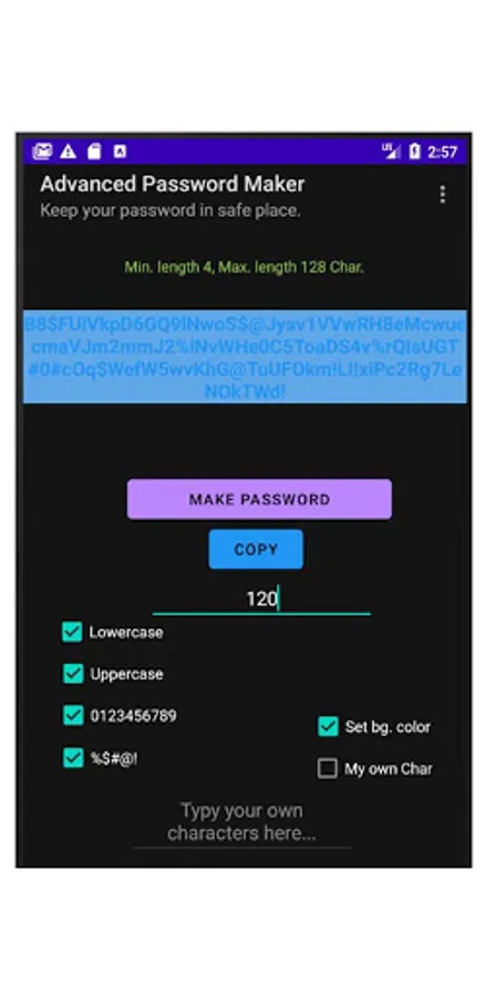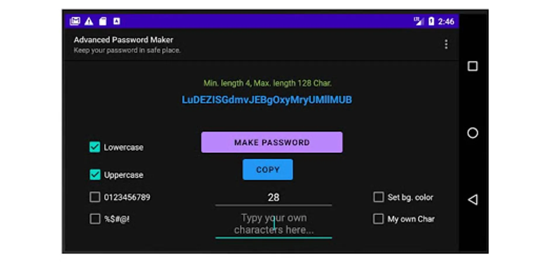 With this application user can generate random password, long or short password, Uppercase/Lowercase/Numbers/Symbols.